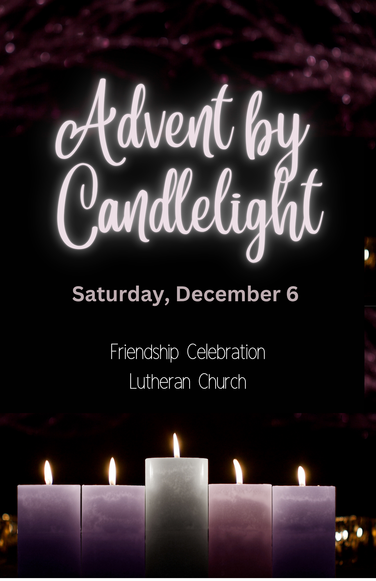 The Advent by Candlelight event will take place on Saturday, December 6, at Friendship Celebration. This event is complimentary. Ladies don’t have to be a member of Friendship Celebration to attend. Everyone is invited! Children are welcome as long as they can sit quietly during the 30-45 minute program. Childcare and breakfast are provided for children not old enough to participate in the event.