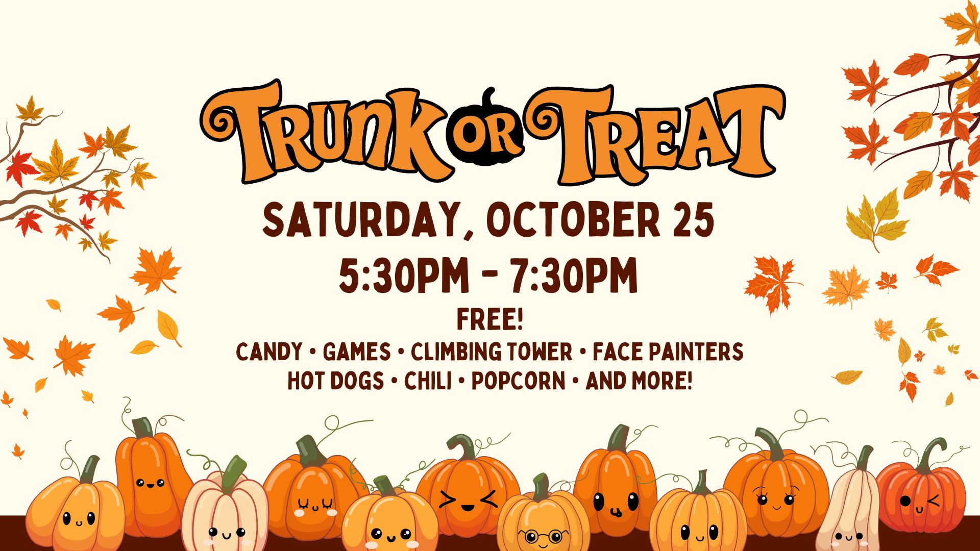 Don’t miss our annual Trunk or Treat on Saturday, October 25 from 5:30pm-7:30pm on the church campus. Bring your family for an evening of fun! Kids can stroll from “trunk to trunk,” collecting candy and marveling at all the creative decorations. Enjoy inflatable games, a rock-climbing wall, face painting, and tasty treats like cotton candy, popcorn, homemade chili, and hot dogs—all completely free! Invite your friends and join the excitement!